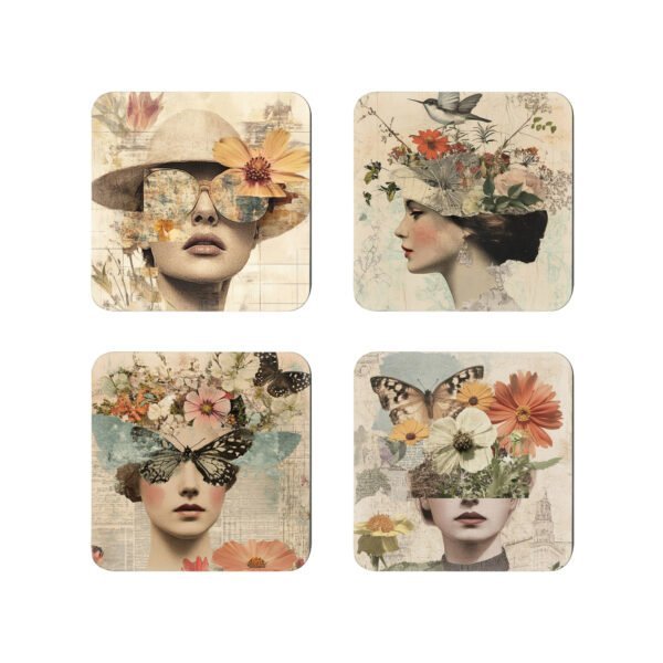 • Set of four high quality square coasters with rounded corners, made from durable Masonite hardboard with a natural cork backing that helps prevent slipping and protects furniture.