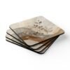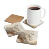 • Set of four high quality square coasters with rounded corners, made from durable Masonite hardboard with a natural cork backing that helps prevent slipping and protects furniture.